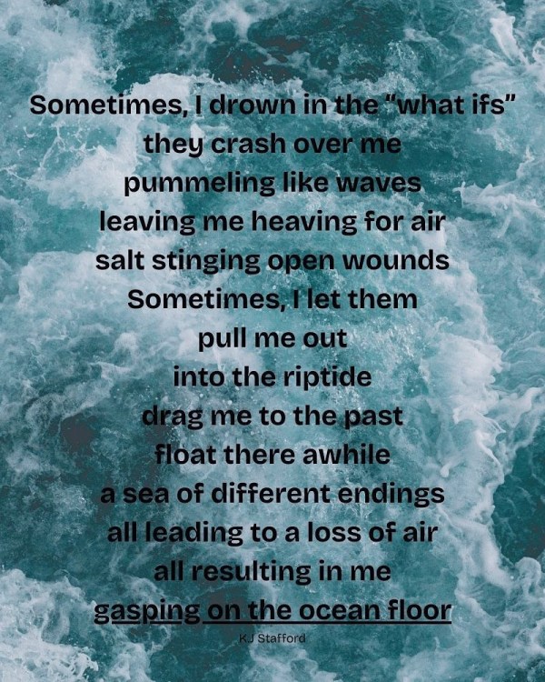 Sometimes I drown in "what ifs"they crash over mepummeling like wavesleaving me heaving for airsalt stinging open woundsSometimes, I let thempull me outinto the riptidedrag me to the pastfloat there awhilea sea of different endingsall leading to a loss of airall resulting in megasping on the ocean floor